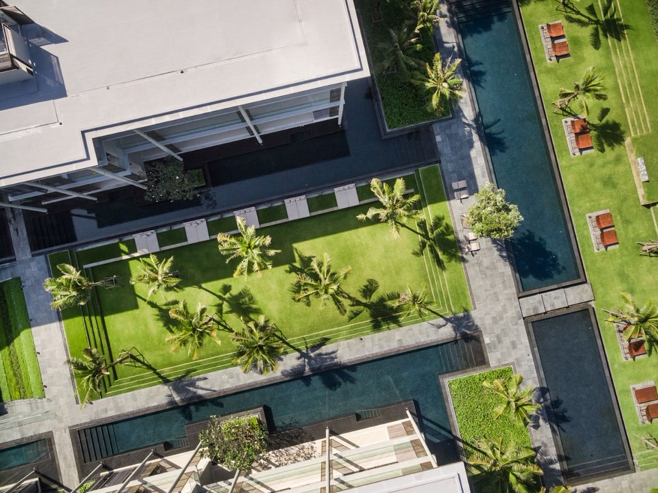在設(shè)計(jì)中,建筑師引入了西方規(guī)則式庭院的元素,并將其與建筑內(nèi)使用的東方風(fēng)格的雷紋相結(jié)合。規(guī)則式庭院能夠容納各種功能空間,其概念由當(dāng)?shù)刂参飦?lái)實(shí)現(xiàn),它們不僅提供了樹(shù)蔭空間,同時(shí)還非常適合泰國(guó)的當(dāng)?shù)貧夂?,更為重要的是,它們還體現(xiàn)了邁考海灘的特色。