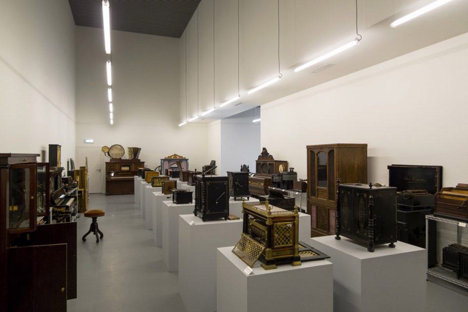這座博物館由一個(gè)完全封閉的、不透明的抽象盒子構(gòu)成,僅有主立面上的一個(gè)凹洞標(biāo)明了入口所在。建筑內(nèi)部容納著有關(guān)機(jī)械音樂的私人收藏。