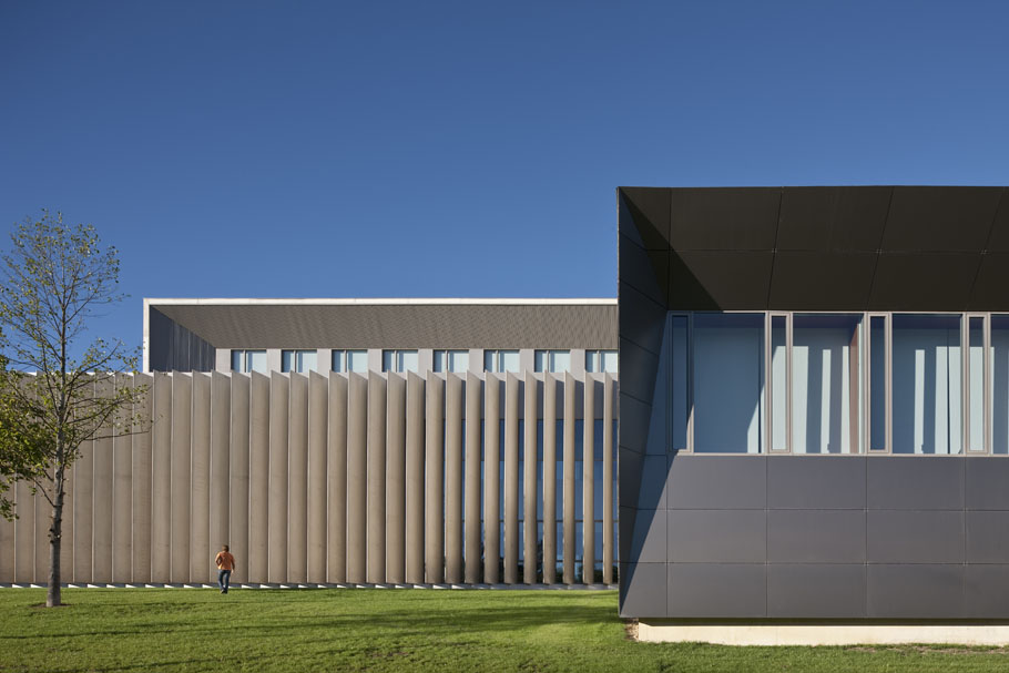 The construction is attached to the Law building, as mentioned, with a similar size and loyal to its essential alignments and the addition of a new common fa?ade. This is justified by the solution offered for access, and acquires outstanding importance in the result given its exceptional length, and as it it’s the one providing the background to the mentioned green campus. It is designed as a fa?ade with a serried structure and rhythmic expression, coherent with its scale. It is made up by a system of vertical concrete elements able to act as a filtering device of space and views, as a parasol for the sections of the elevation framed by their vocation of opening and transparency.